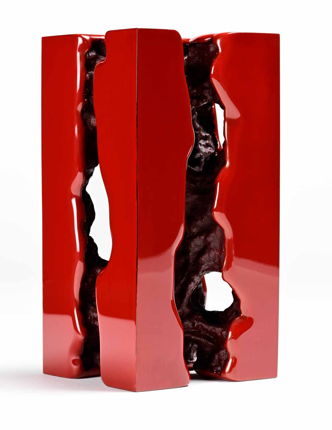L’intensité du rouge profond, obtenue par des techniques de teinture et de laque, confère à ses œuvres une aura vibrante et une présence sculpturale unique. À travers des formes organiques et dynamiques, Yonezawa Jirō joue avec la lumière et l’espace, offrant des pièces qui évoluent selon l’angle de vue. Son exceptionnelle maîtrise du bambou lui permet de créer des sculptures où force et fluidité s’entrelacent, rendant chaque œuvre à la fois puissante et poétique.
