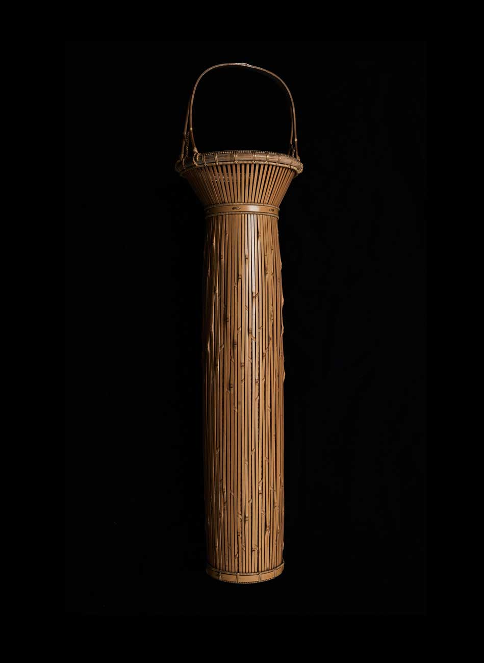 (« Panier à fleurs suspendu en bambou blanc intitulé Falaise des Bois, réalisé par Hōsai »)