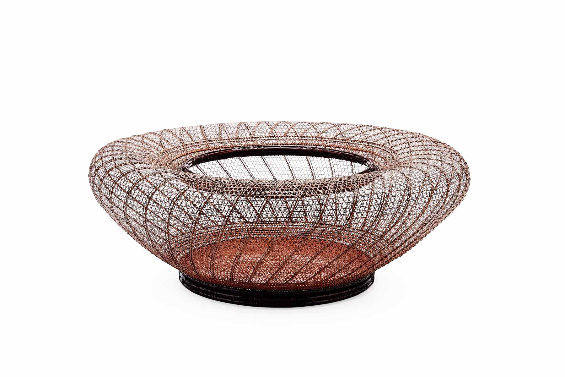 Il a tressé des tiges de bambou extrêmement fines en diagonale et a créé un autre motif en tressant le rotin. L'effet visuel forme une spirale.