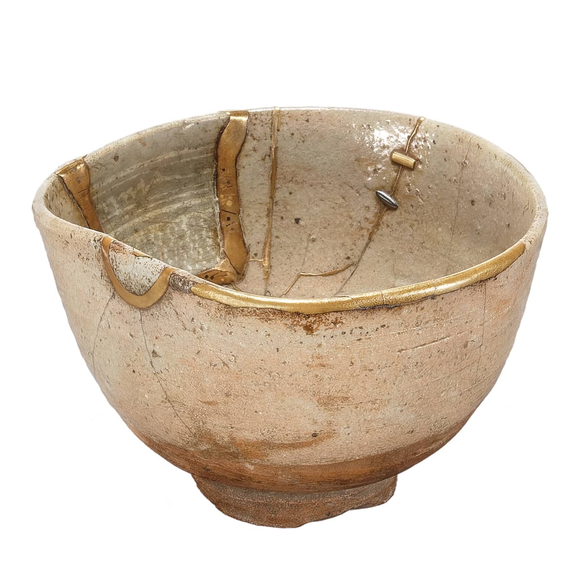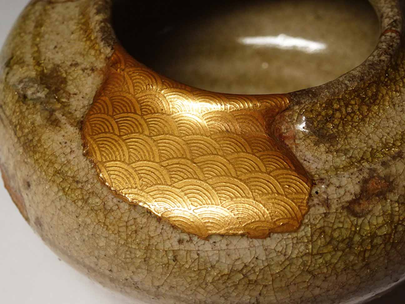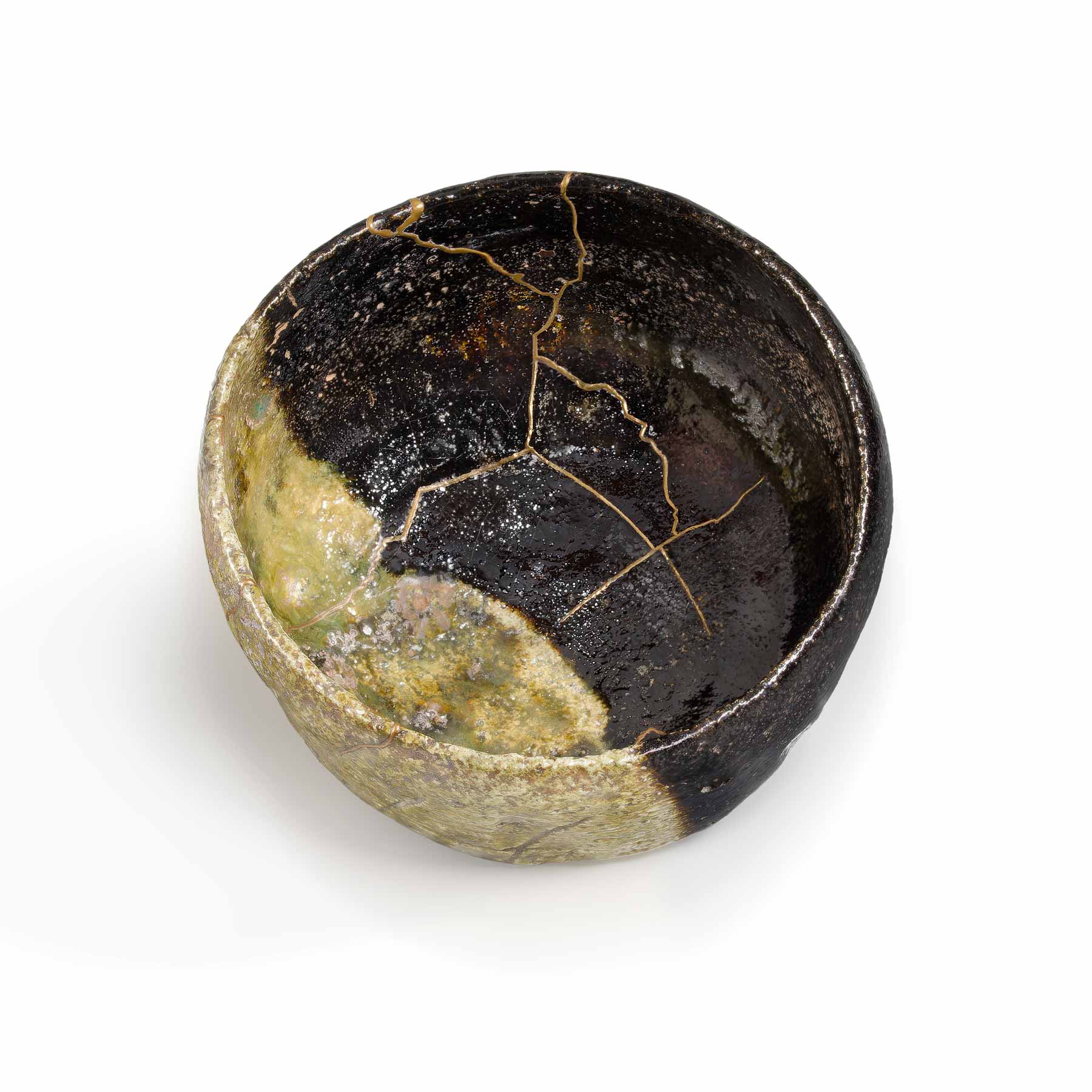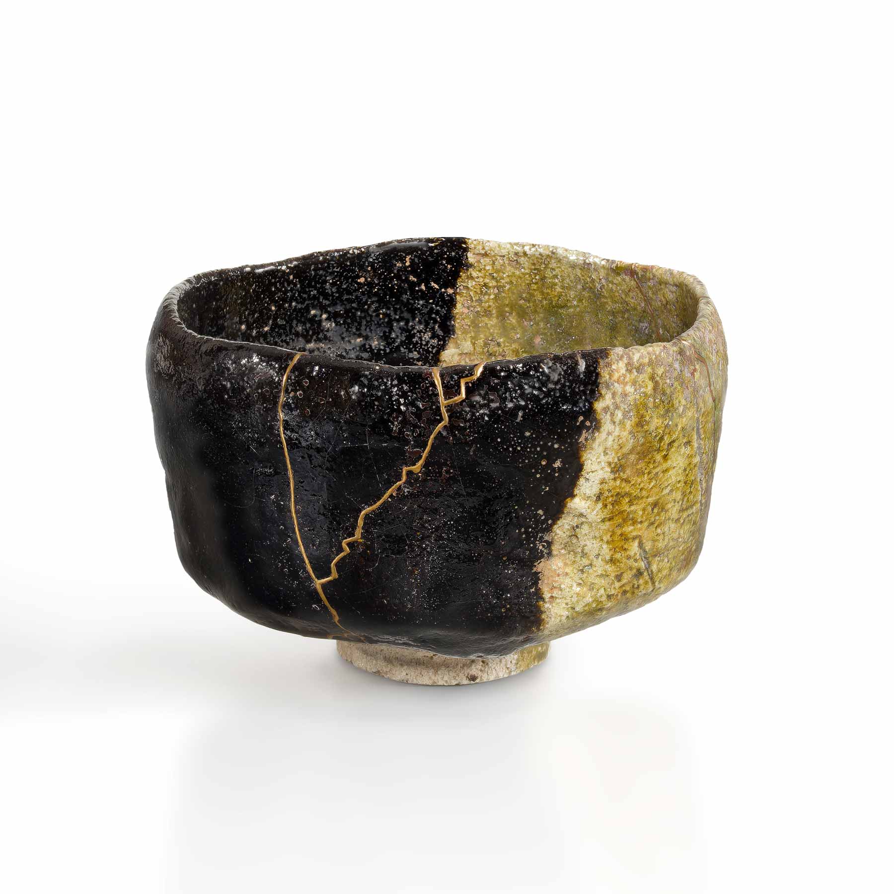 Bol bicolore de la 12e génération Raku Kichizaemon (Konyu, 1857-1932) enfermé dans la boîte en bois originale signée intitulée Kakewake Raku Chawan. L'éclairage étincelant est composé de fines laques recouvertes d'or véritable là où le bol était autrefois cassé et a été réparé. L'or brille à la fois sur les côtés noir et vert du chawan, à l'intérieur comme à l'extérieur. Assez frappant et une réparation de qualité supérieure. Il mesure 12 cm (5 pouces) de large et 8 cm (3-1/4 pouces).