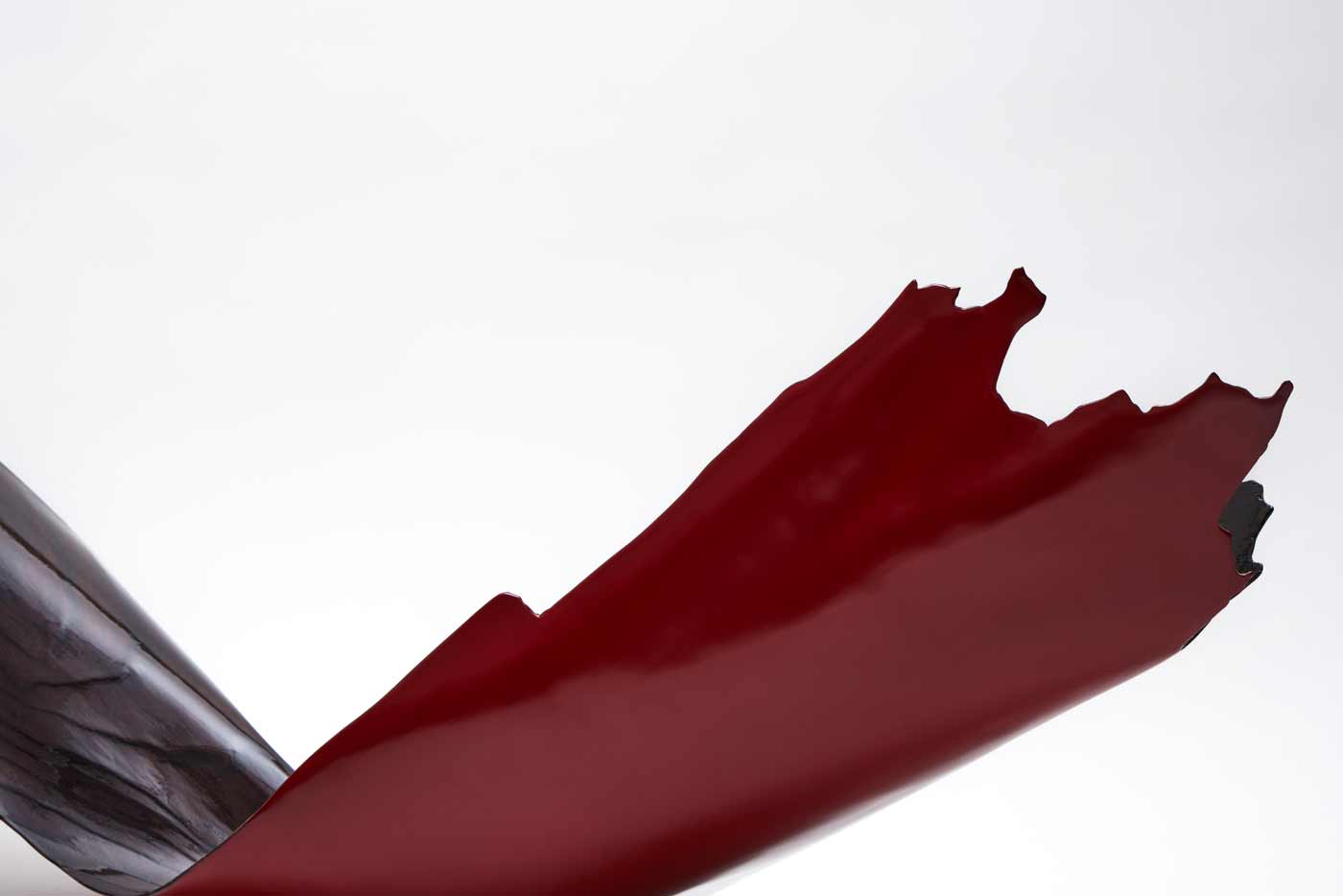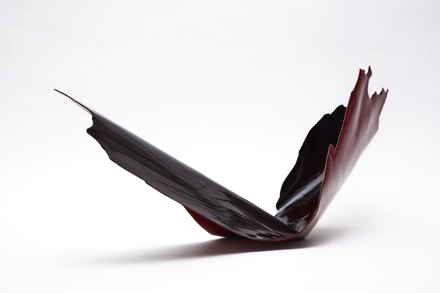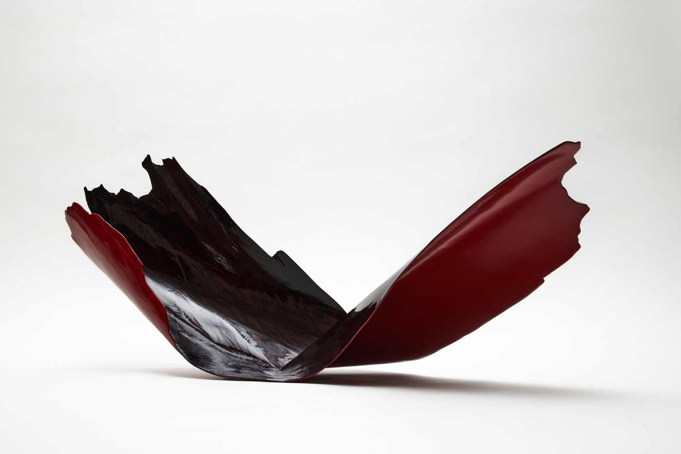 Il sculpte ses formes dans du bois de keyaki (Zelkova serrata) qu'il recouvre de dizaines de couches de laque urushi polie.