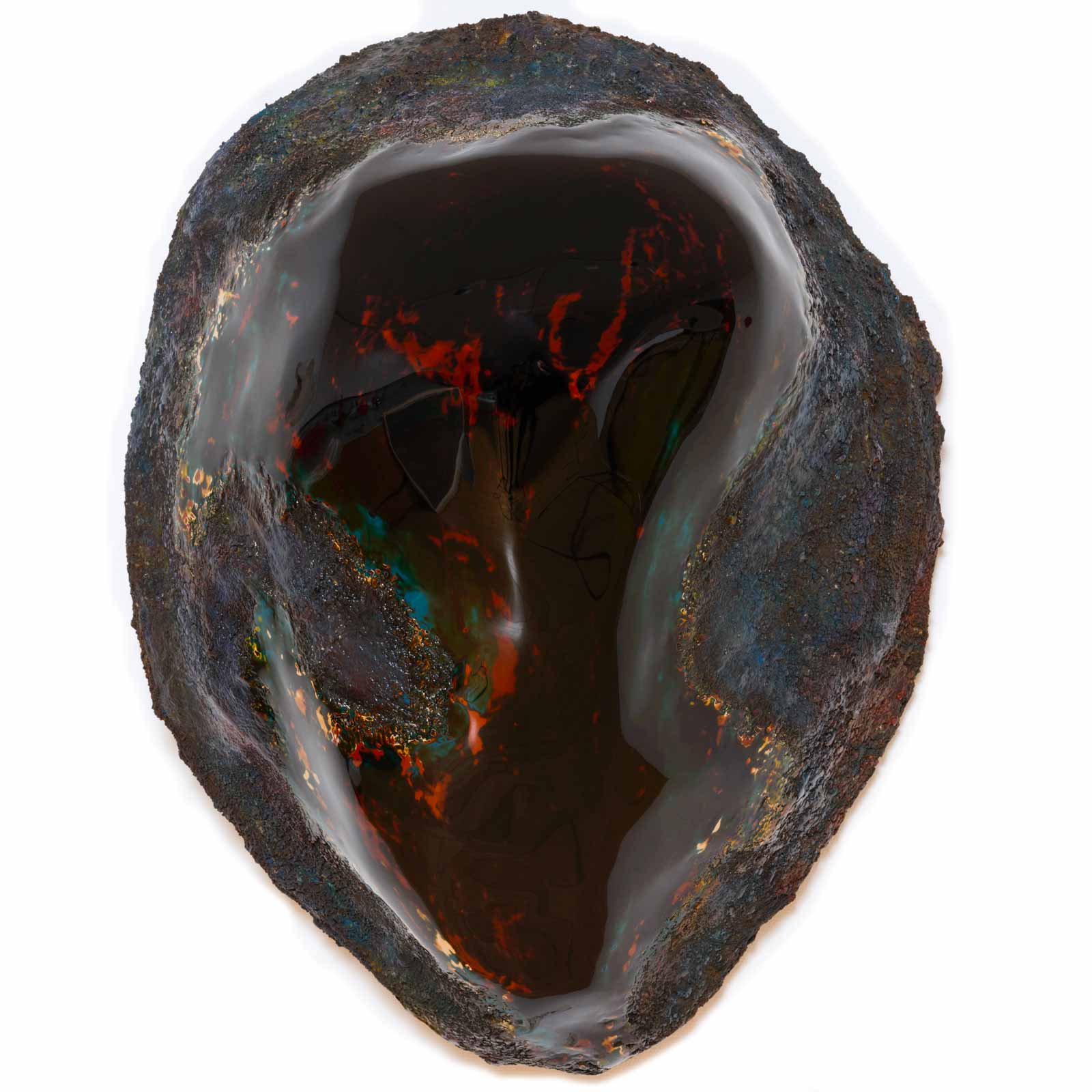 Ses œuvres déploient une palette chromatique vibrante, mêlant rouges ardents, noirs profonds, reflets bleutés et éclats cuivrés. Ces jeux de matière et de lumière confèrent à chaque sculpture une présence presque tellurique.