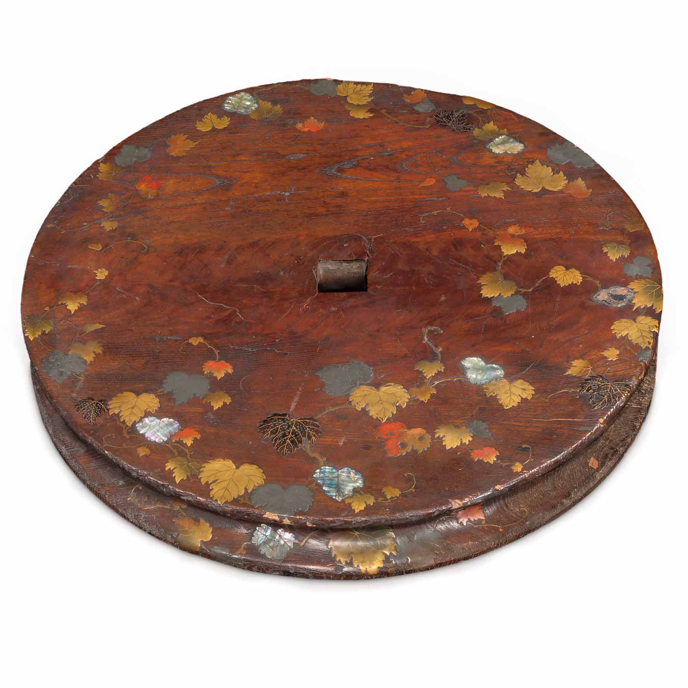 Cette très ancienne poulie de puits en bois était utilisée au cours de la période Edo avant d’être transformée en support pour présenter une composition florale ikebana. La roue est ornée de feuilles de lierre (tsuita), un motif apprécié par les artistes Rinpa. Cet ornement évoque une peinture d’Ogata Kenzan (1663-1743) d’un poème faisant référence aux vents futurs éparpillant des feuilles de lierre pourpres et rappelle une scène célèbre des Contes d'Ise (Ise monogatari) du 10e siècle, dans laquelle un courtisan, exilé de la capitale, rencontre un moine itinérant sur un chemin du mont Utsu parsemé de lierres.