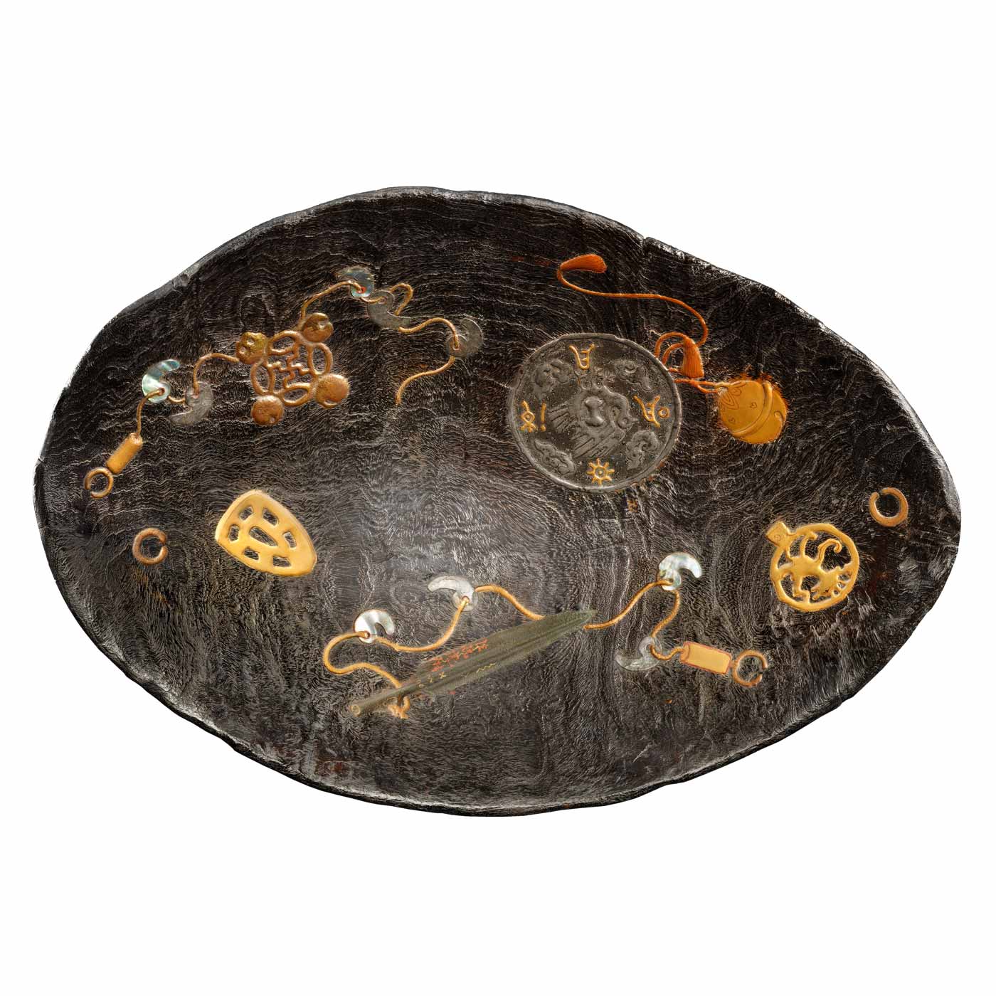 D'anciens symboles de pouvoir sont dispersés sur la surface d'un bois brut naturel. Les motifs comprennent des perles magatama en nacre et en plomb, un miroir en argent avec des motifs calligraphiques dorés, une tête de lance gravée, la tête dorée d'un bâton, etc. La boîte de collection est intitulée Kōrin maki-e mokusei kashibon (plateau à sucreries en bois décoré de motifs en laque dans le style de Kōrin). Une œuvre d'art spectaculaire combinant la magnifique technique d'Ogata Kōrin (1658-1716) et l'appréciation du wabi-sabi dans la surface en bois dégradée.