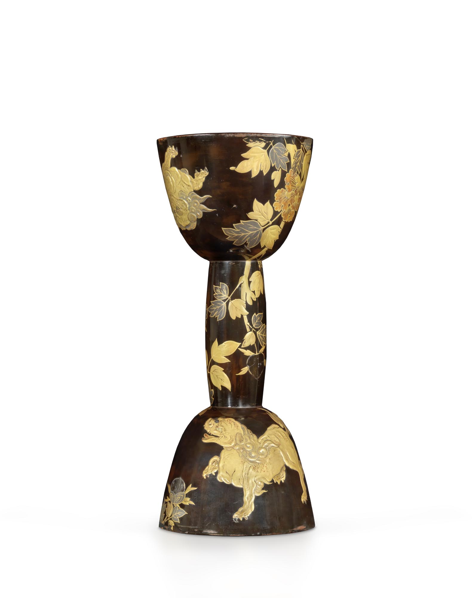 The motif of shishi-botan is lacquered dynamically on the body of drum and the box. Shishi-botan, literally lion and peony, has been a very popular motif in Japan. Shishi was believed as the king of all animals. And also, peony was believed as the king of all flowers. The motif of shishi and peony has been called “shishi-botan’ or ‘karajishi-botan’. They were very often depicted together since ancient time. The original idea came from Buddhism. It was said that only one thing which could kill the strongest animal, shishi, was an insect in his body. And it was believed that the night dew of peony was the only one thing which can kill this insect. This motif was loved as a bold symbol and splendid combination.