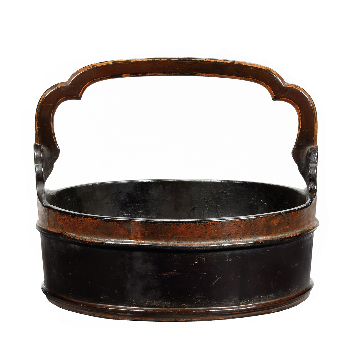 A large open shallow bucket shape with elaborate handle called an Oke (Pronounced okay) covered in black and red lacquer in the style known as Negoro dating from the Muromachi period (14th-15th century).