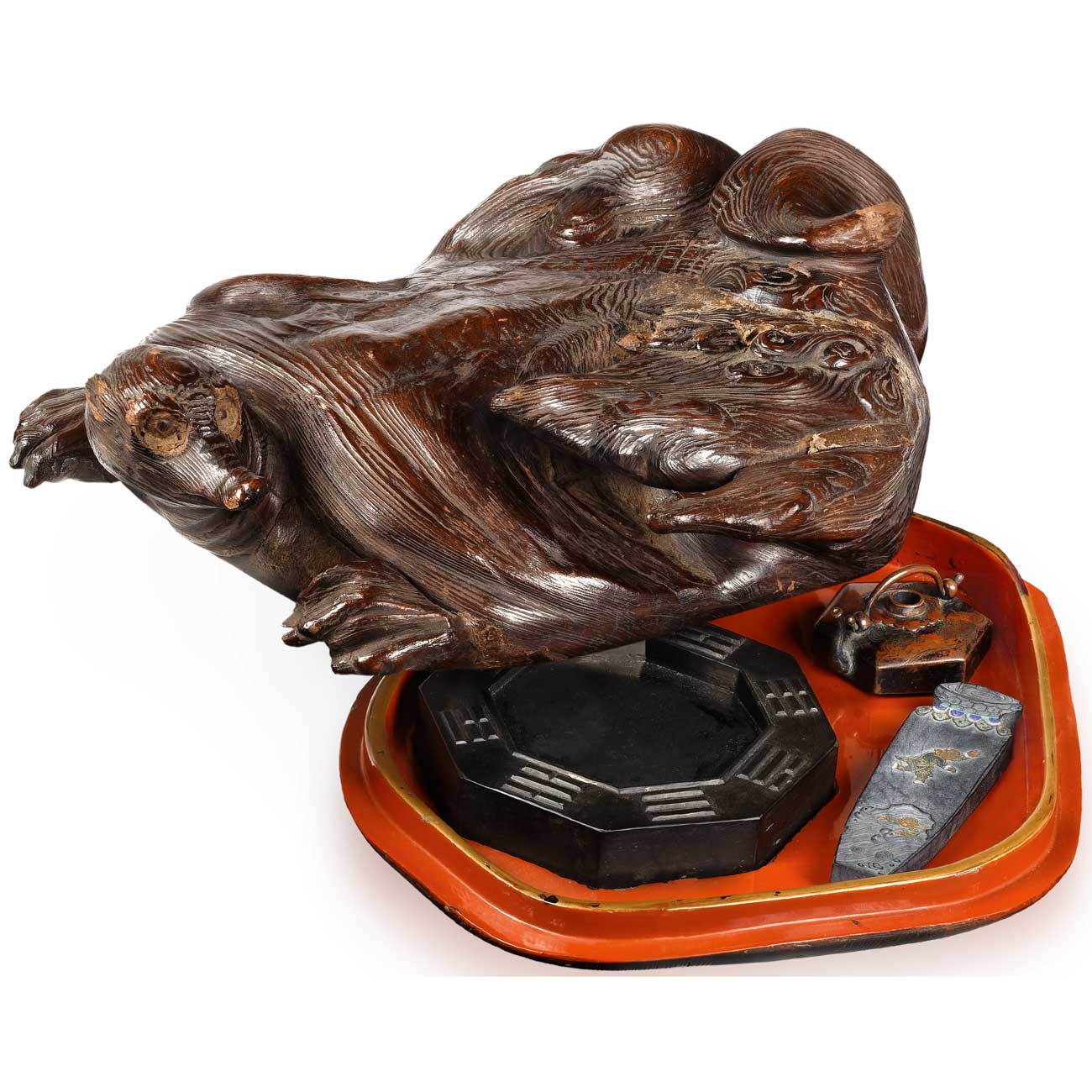 Ancien fragment de matsu (pin) transformé en plateau à sencha et orné d’une langouste, d’un poulpe et d’un turbot