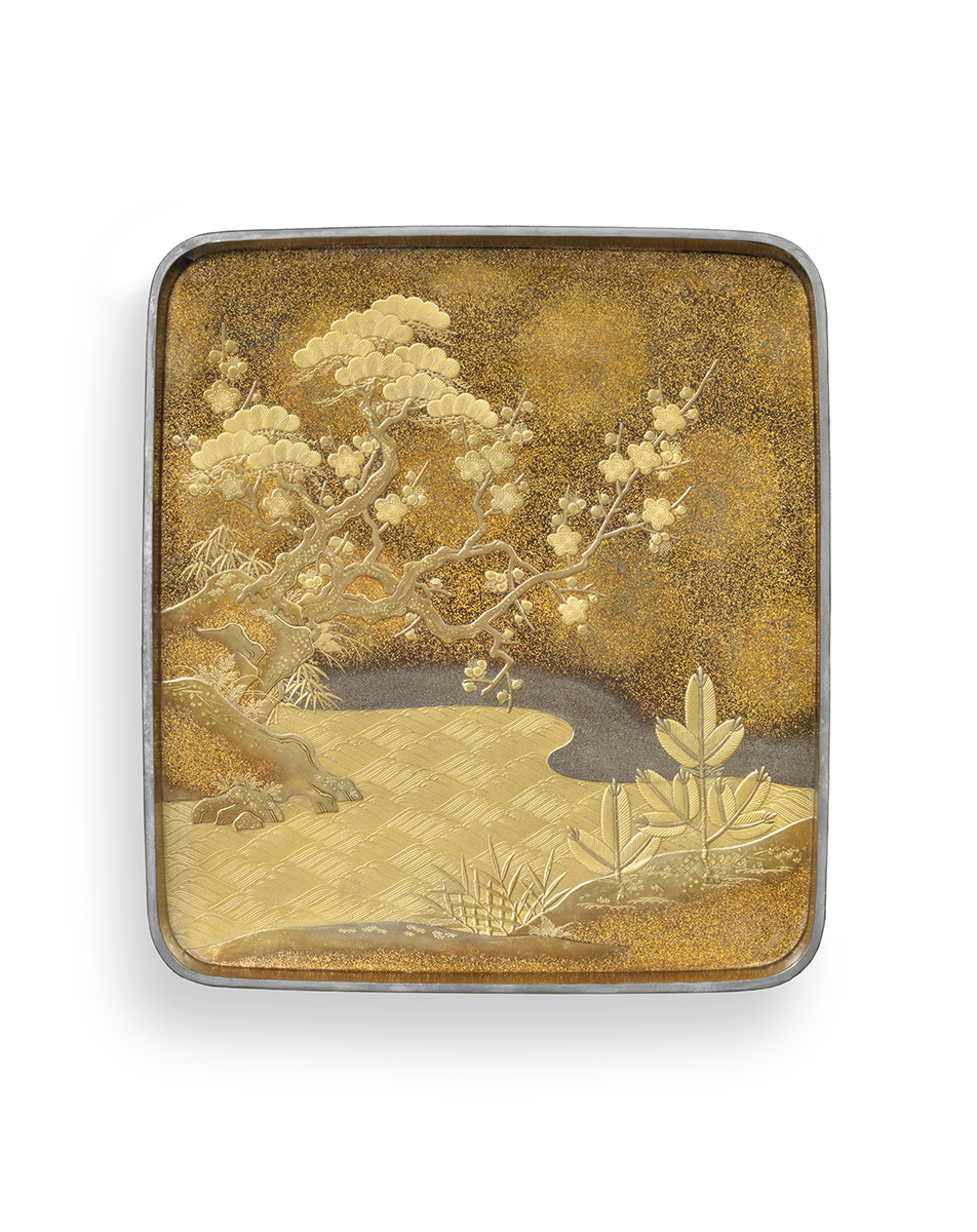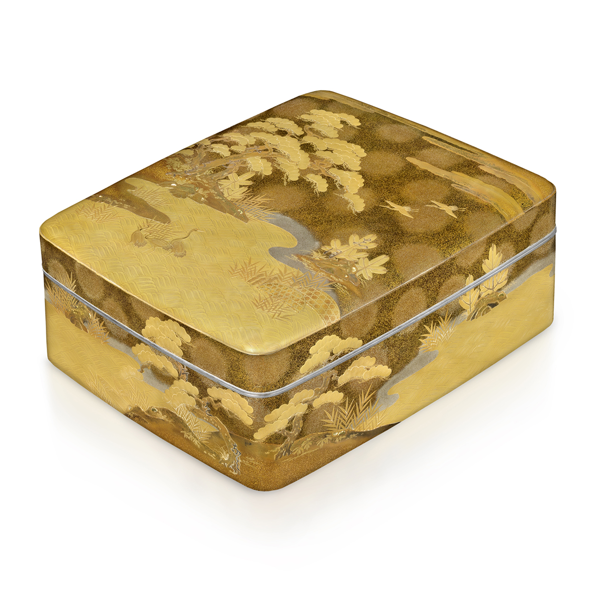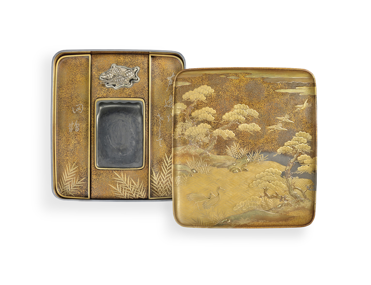 Cet ensemble, dans un parfait état de conservation, est un véritable chef-d’oeuvre et il a été réalisé avec différentes techniques de laque. Le taka-makie apporte un effet cubique; le kirikane dépeint l’aspect de la mousse en apposant directement des feuilles de metal doré; le kimetsuke est utilisé pour représenter les trous dans le sol et les rochers, en plaçant des fragments de métal doré sur la surface. Cependant, la technique du nashiji est la plus importante et vient compléter ces pièces pour les transformer en véritable chefs-d’œuvre. Elle recouvre l’intégralité de la pièce, même l’arrière et l’intérieur du couvercle. Les innombrables touches réalisées en variant la densité de la poudre d’or apportent une impression illusionniste marquante. Les gouttes d’eau sont faites à partir de morceaux de minogame (écailles de tortue avec des algues), propices à symboliser la longévité. Les caractères dissimulés sont partiellement séparés de l’ensemble de la composition, et ils sont différents sur la boîte fixe et la boîte contenant la pierre à encre. Lorsqu’ils sont mis côte à côte, les caractères se complètent et reconstituent l’ensemble du poème, parfaitement calculé.