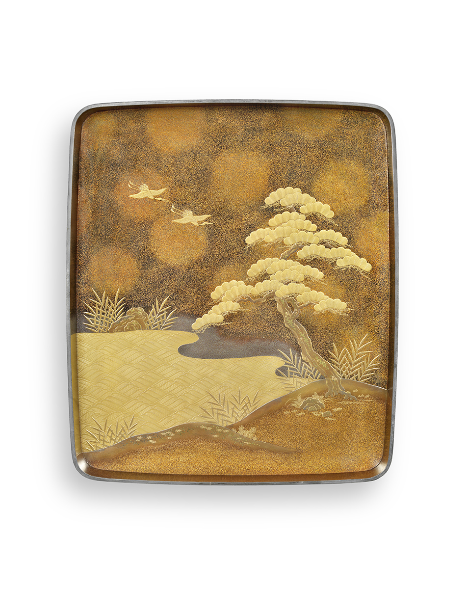 Les deux pièces représentent des grues sur la rive d’une rivière bordée par des roseaux. Il pourrait s’agir d’un simple décor agréable de prime abord, mais les caractères dissimulés par le laqueur révèlent qu’il s’agit d’un motif inspiré par un waka très connu, le poème traditionnel japonais “Waka-no-ura”.