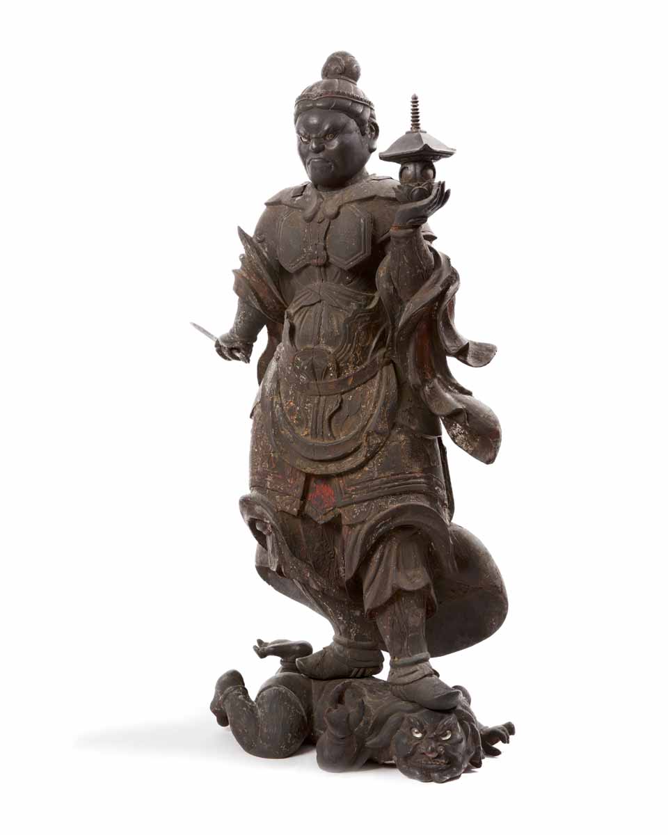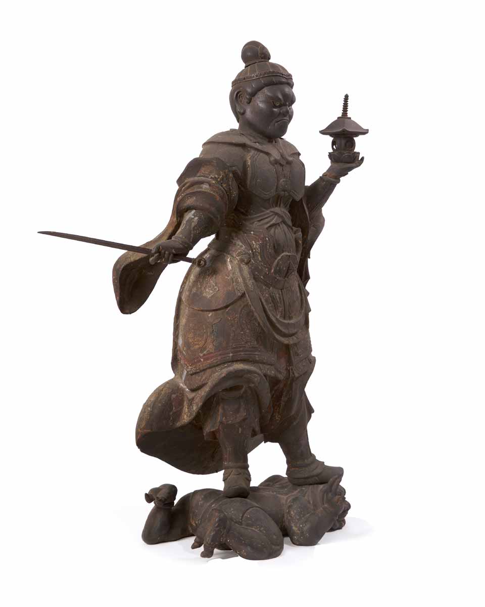 Dieu protecteur du panthéon bouddhiste, gardien du Nord, il anéantit les forces démoniaques et protège les trésors spirituels. Œuvre typique de l'époque de Kamakura.