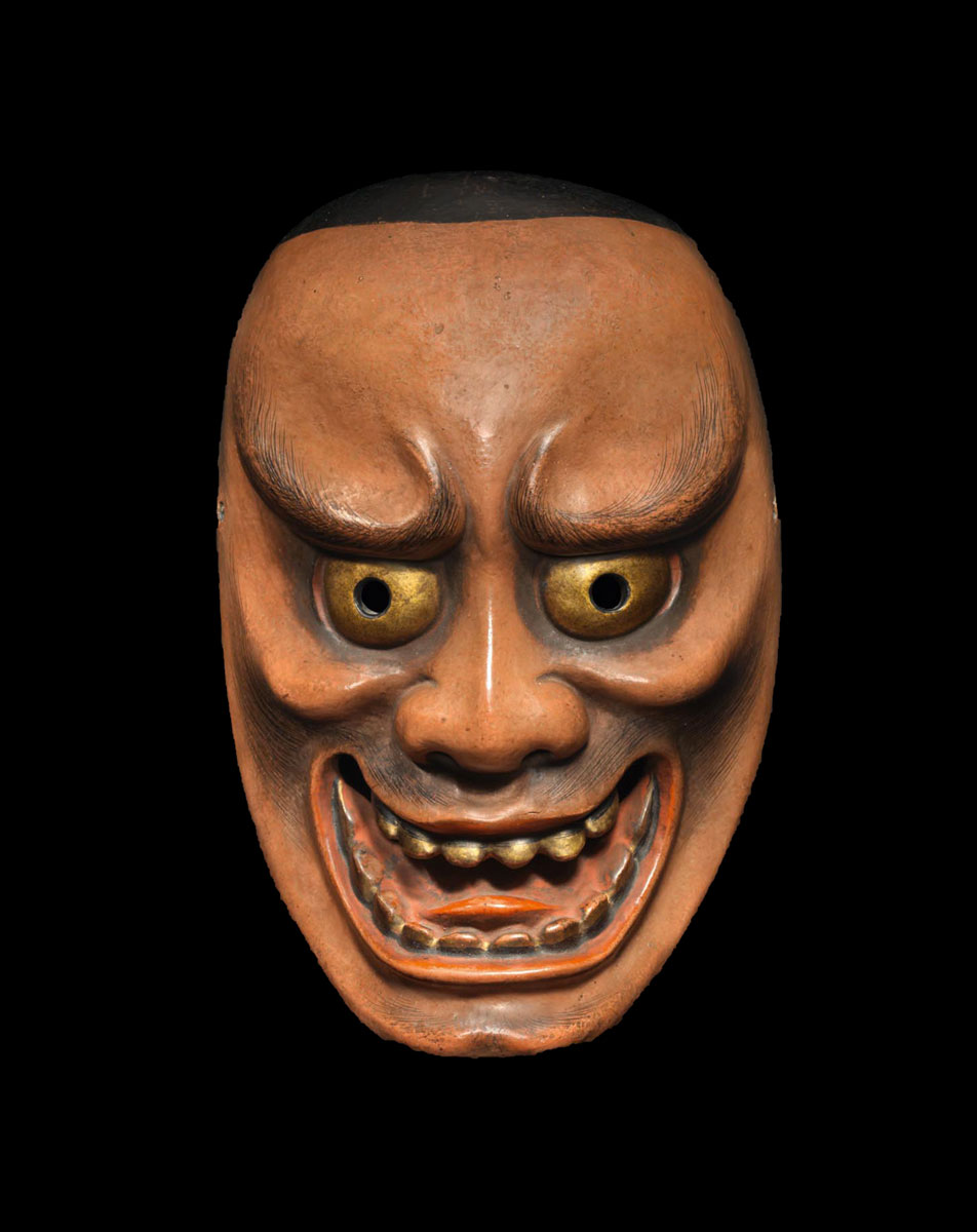 Its name derives from its thick, black mustache and beard. The entire mask is painted a dark flesh color, and it is worn for dragon-god roles in plays like Chikubushima, Mekari, Kasuga Ryujin, Kuse-no-to and Orochi.