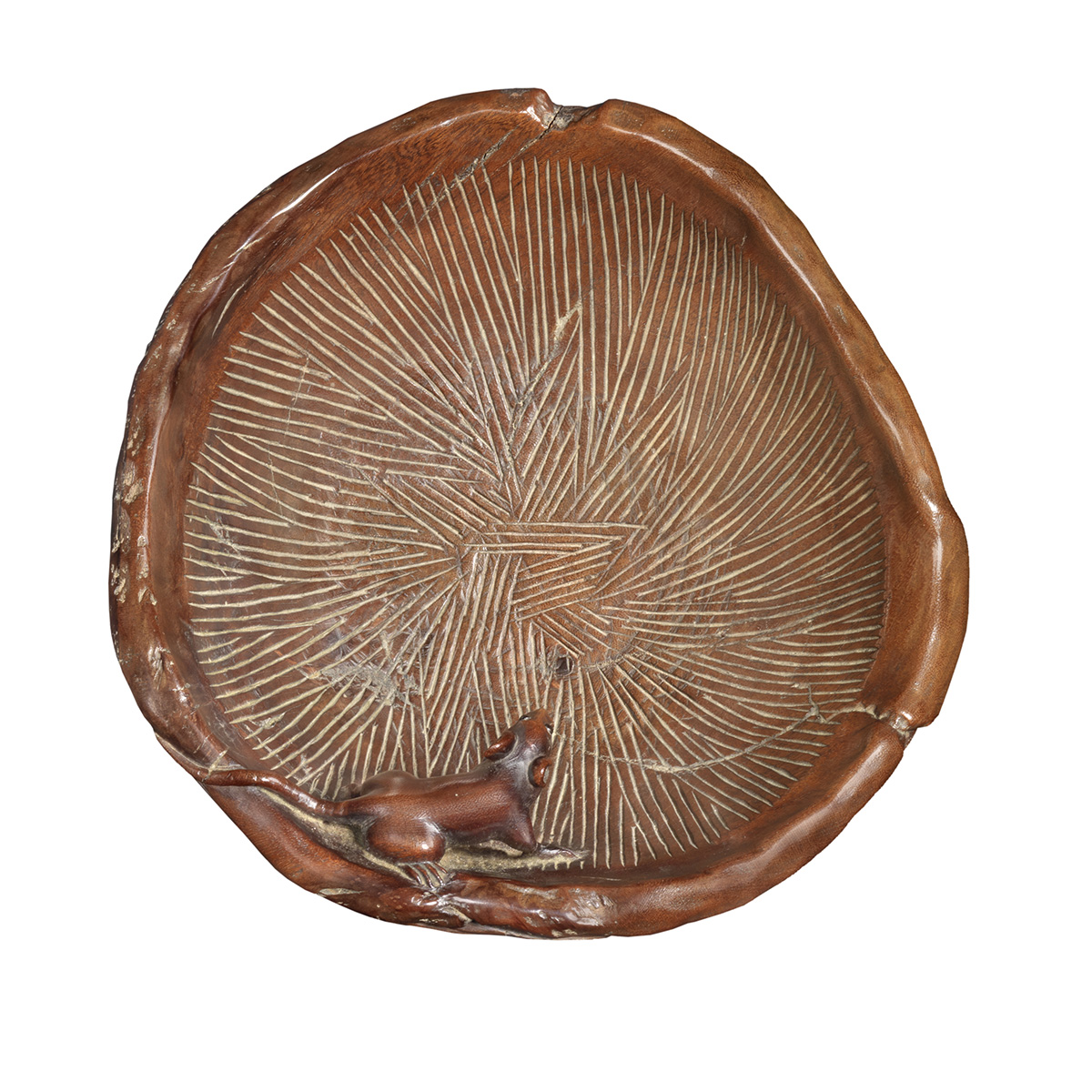 Wonderful wooden okimono with shape of the earthen ware mortar and a mouth. The mortar is cracked in places, but they are carved. The artist realized a ceramic mortar made in hand with reality.